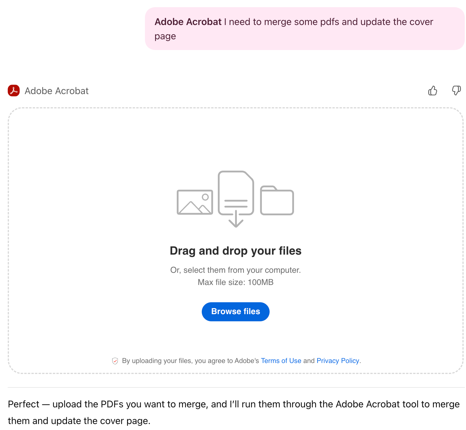 I told ChatGPT I needed to use Adobe to merge some pdfs and then update them. It loads Acrobat right in the chat, then you can drop your files in.