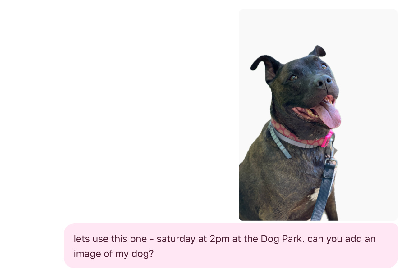 I asked for an invitation for my dog’s birthday party this weekend and Express generated options instantly. I went with something cute, a dog wearing sunglasses.