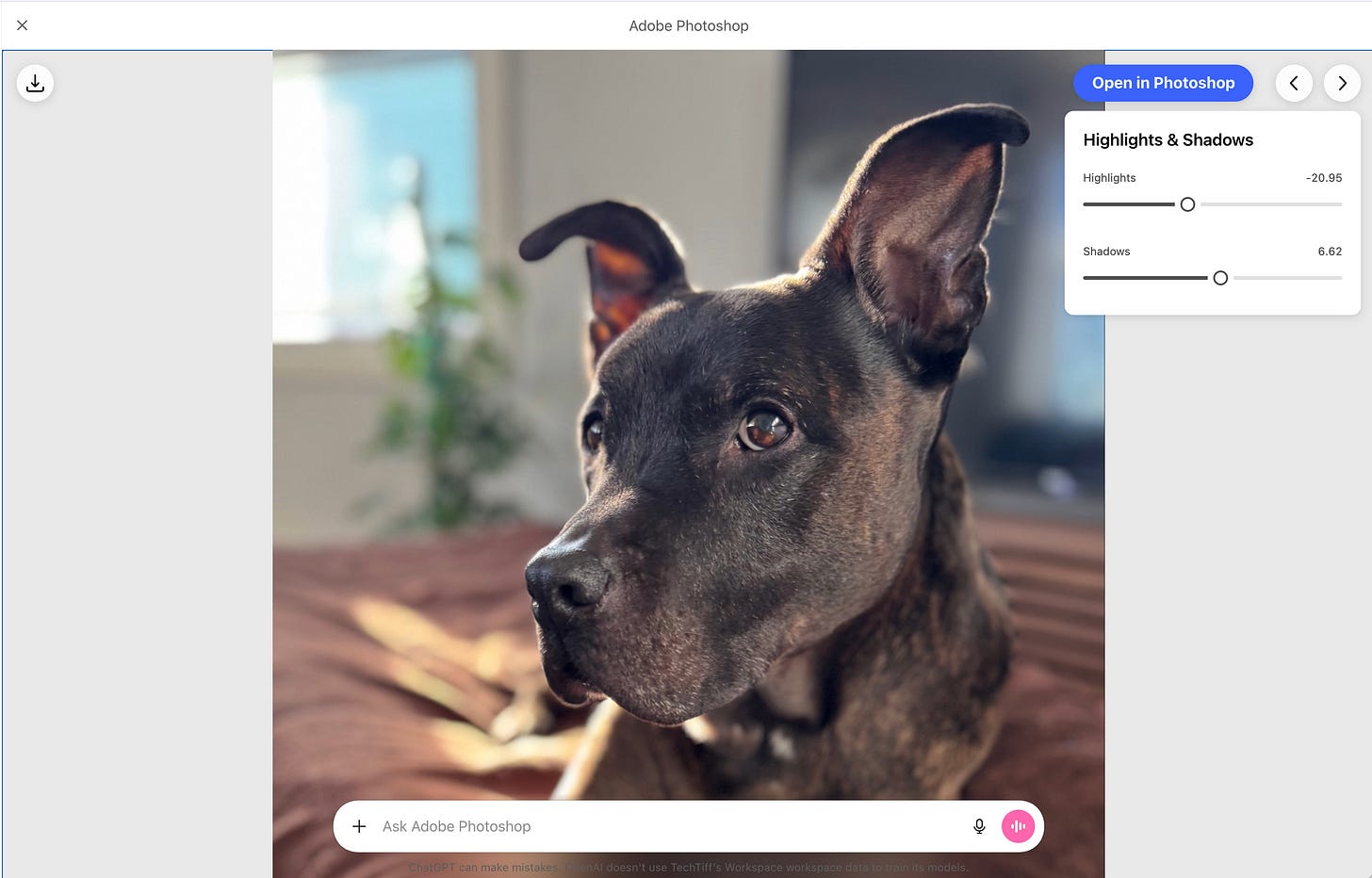 I uploaded a photo of Nike (my dog). Asked ChatGPT to help me adjust the exposure. It opened Photoshop for ChatGPT, analyzed the image, and gave me specific guidance: