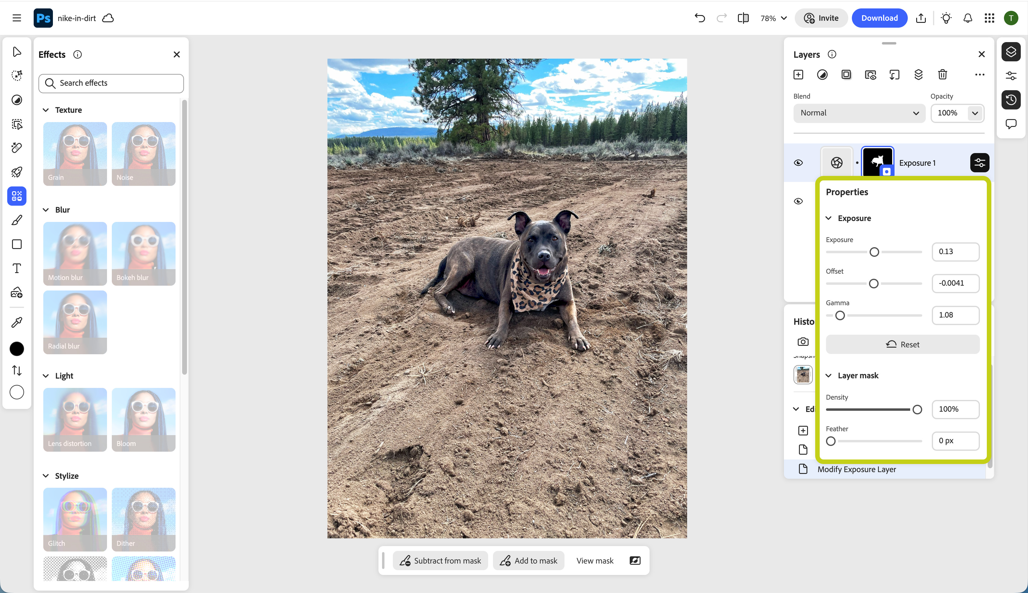Photoshop: Adjust exposure, contrast, brightness. Apply effects to specific areas. Get contextual editing guidance. Edits stay live. Open in Photoshop on web and your layers are intact.