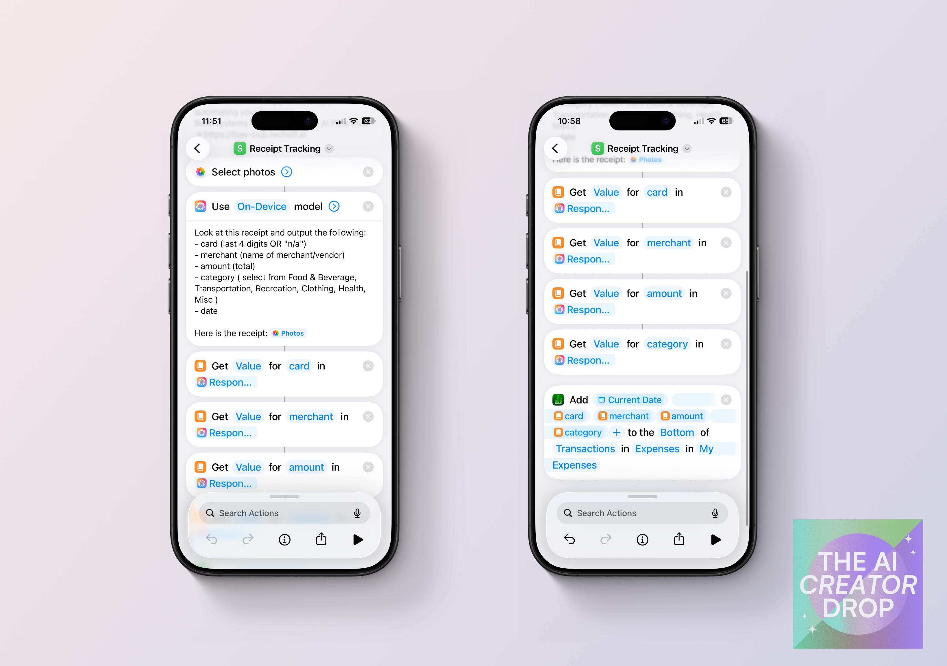 You grab a picture of a receipt from your camera roll, Shortcuts use Apple Intelligence to analyze, extract the merchant, card, amount, and then categorize it. Everything gets logged into your Numbers spreadsheet.