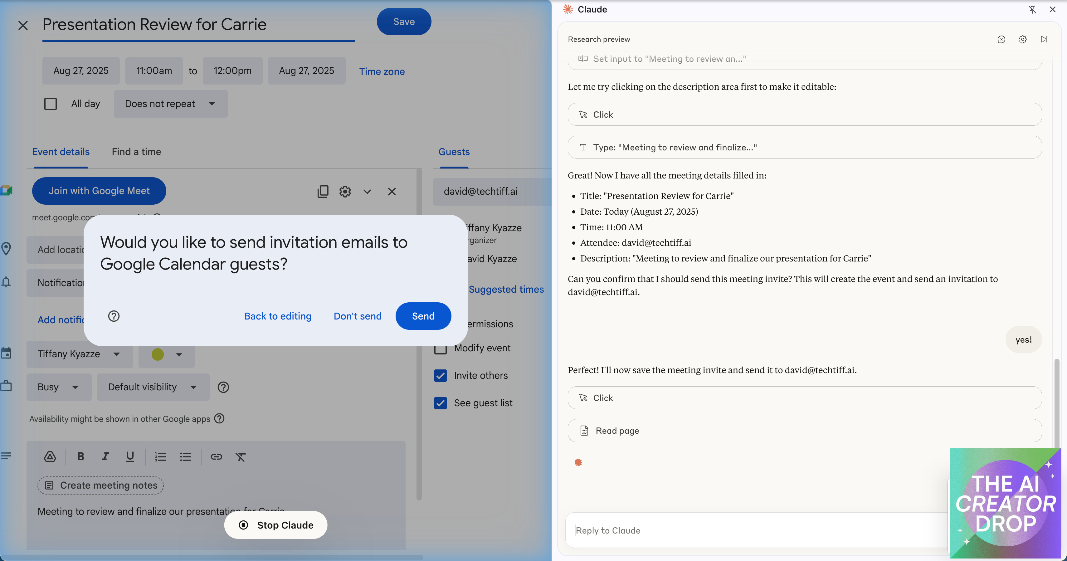 Calendar Management: I asked Claude to book a meeting, and it didn't just find an open slot – it filled in meeting details, sent invites, and even added a thoughtful agenda. It was like having a personal assistant who actually pays attention during meetings.