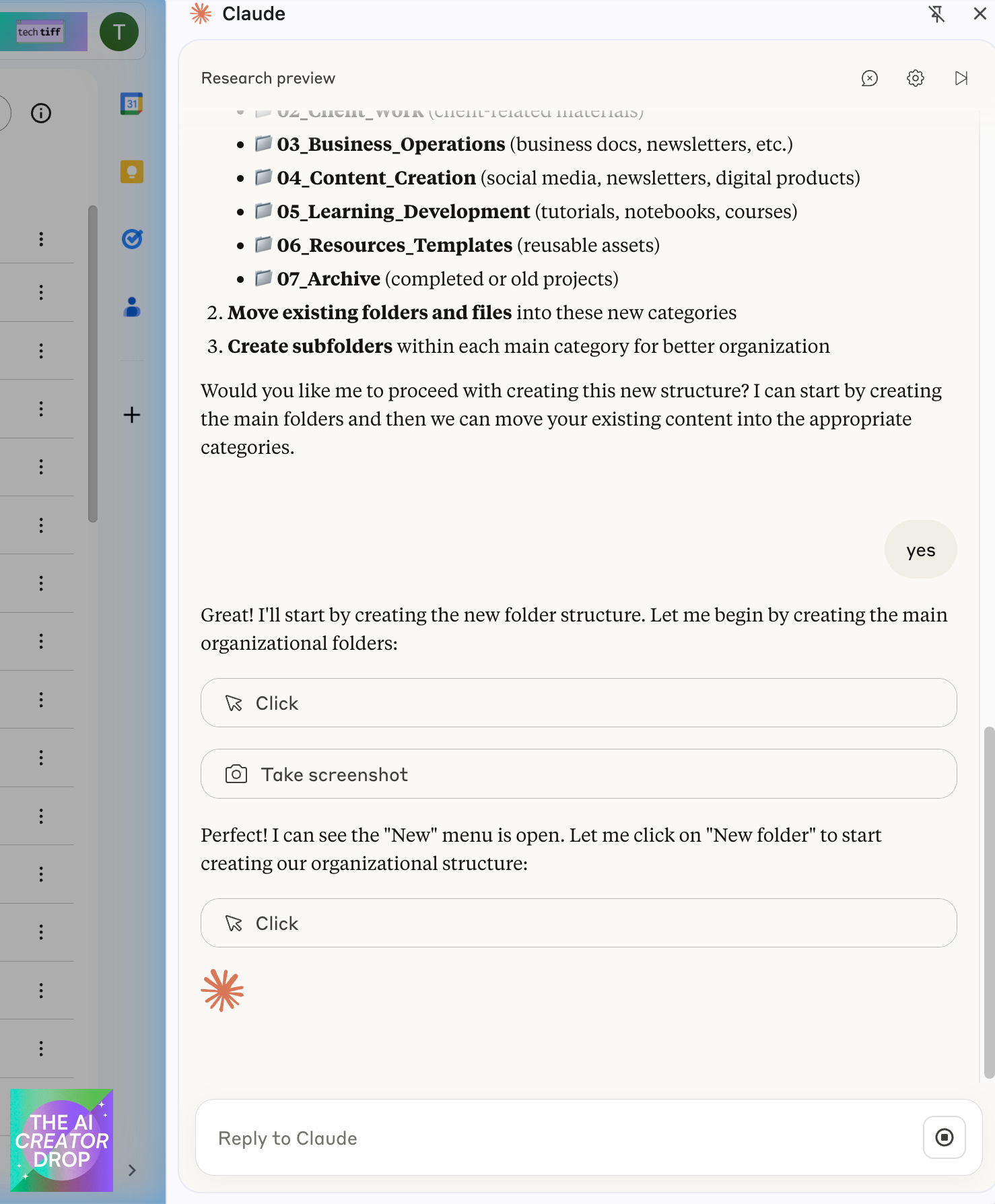 Google Drive Organization: This is where things got interesting. Claude analyzed my chaotic Drive structure (don't judge, we've all been there), proposed a logical folder system, and actually implemented the changes.