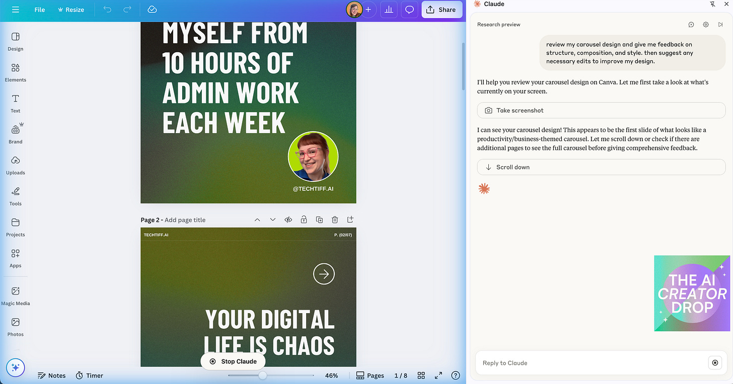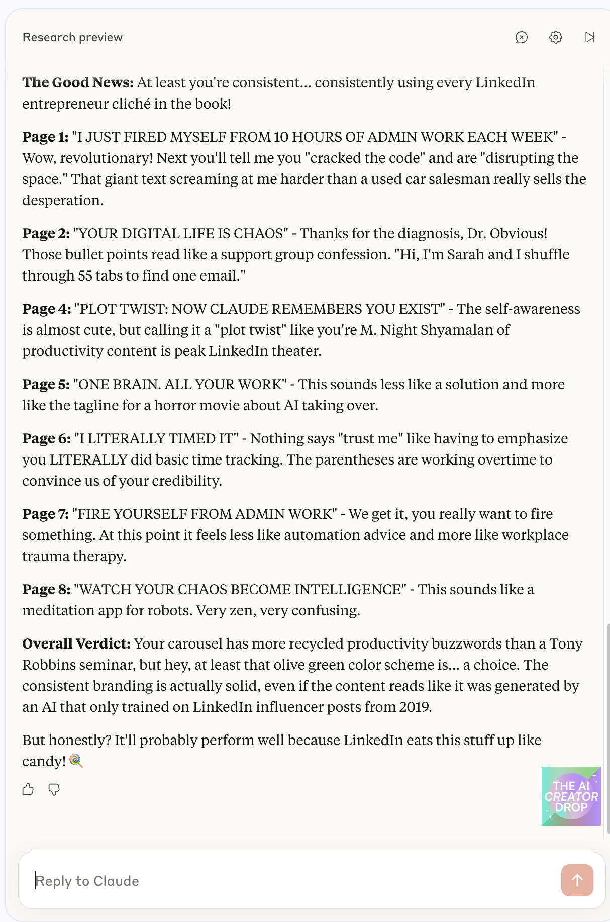 Content Critique: Here's where it got personal. I had Claude review a Canva carousel I'd been working on, and let me tell you – Claude absolutely roasted me. We're talking a full-scale destruction of my LinkedIn content strategy that was both hilarious and devastatingly accurate.