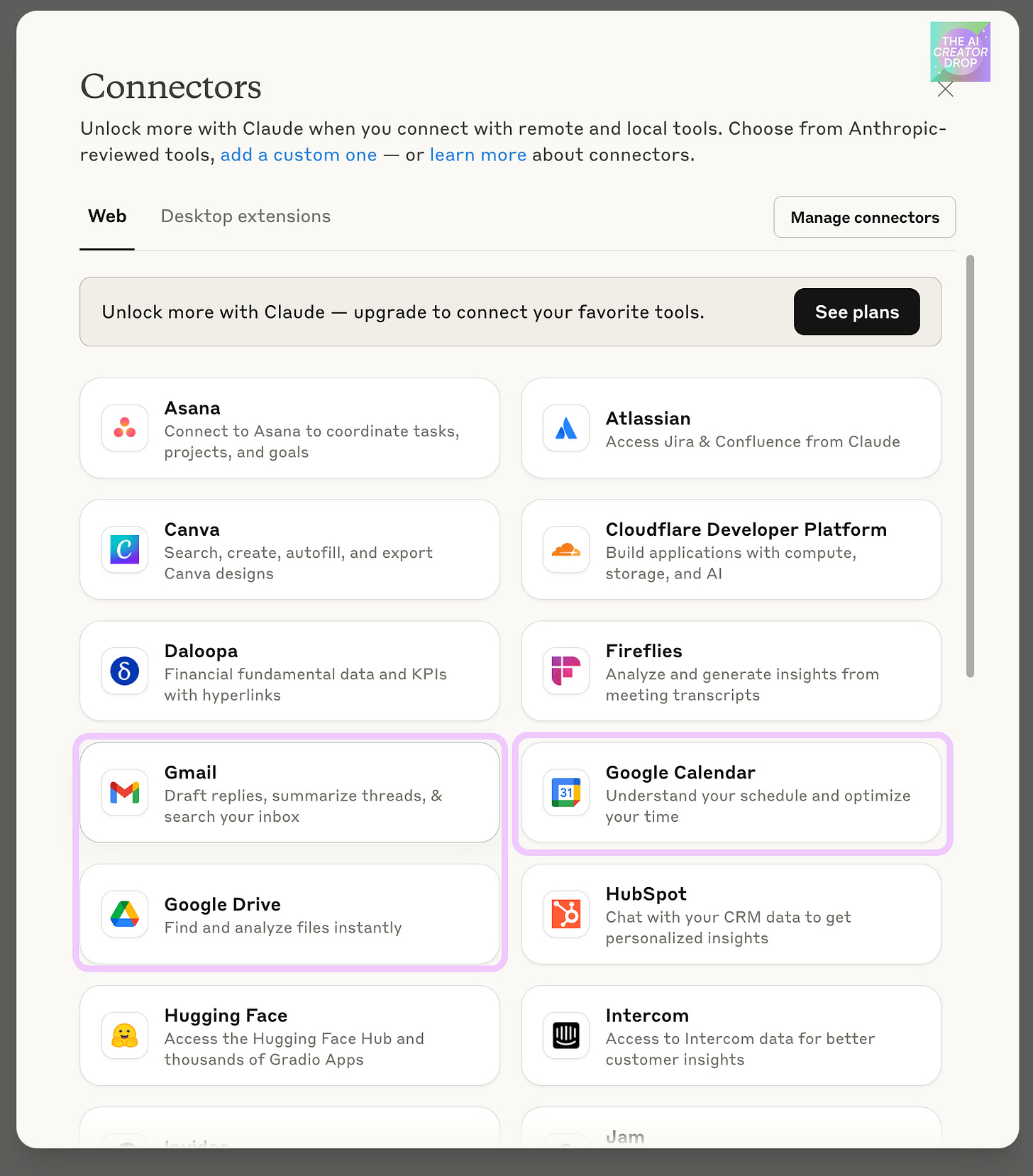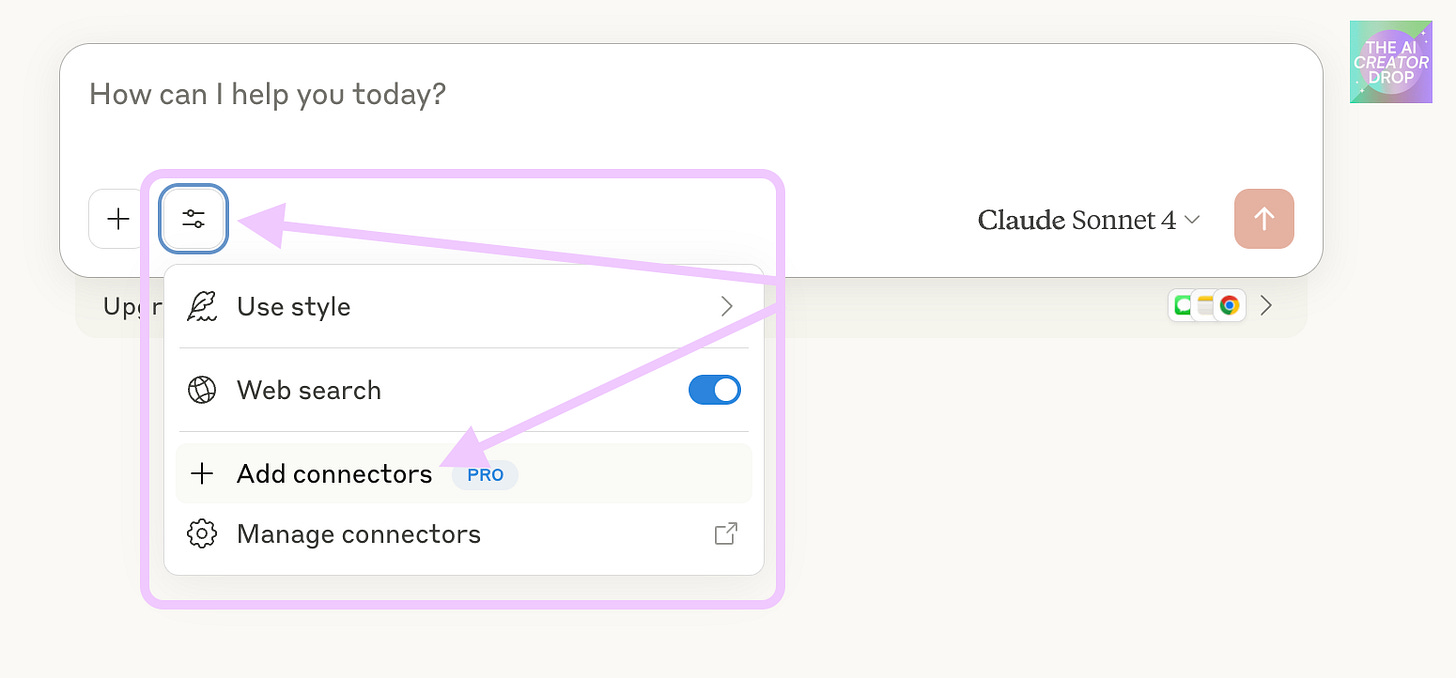 Step 1: Hit the tools menu in Claude, connect Gmail, Calendar, and Drive