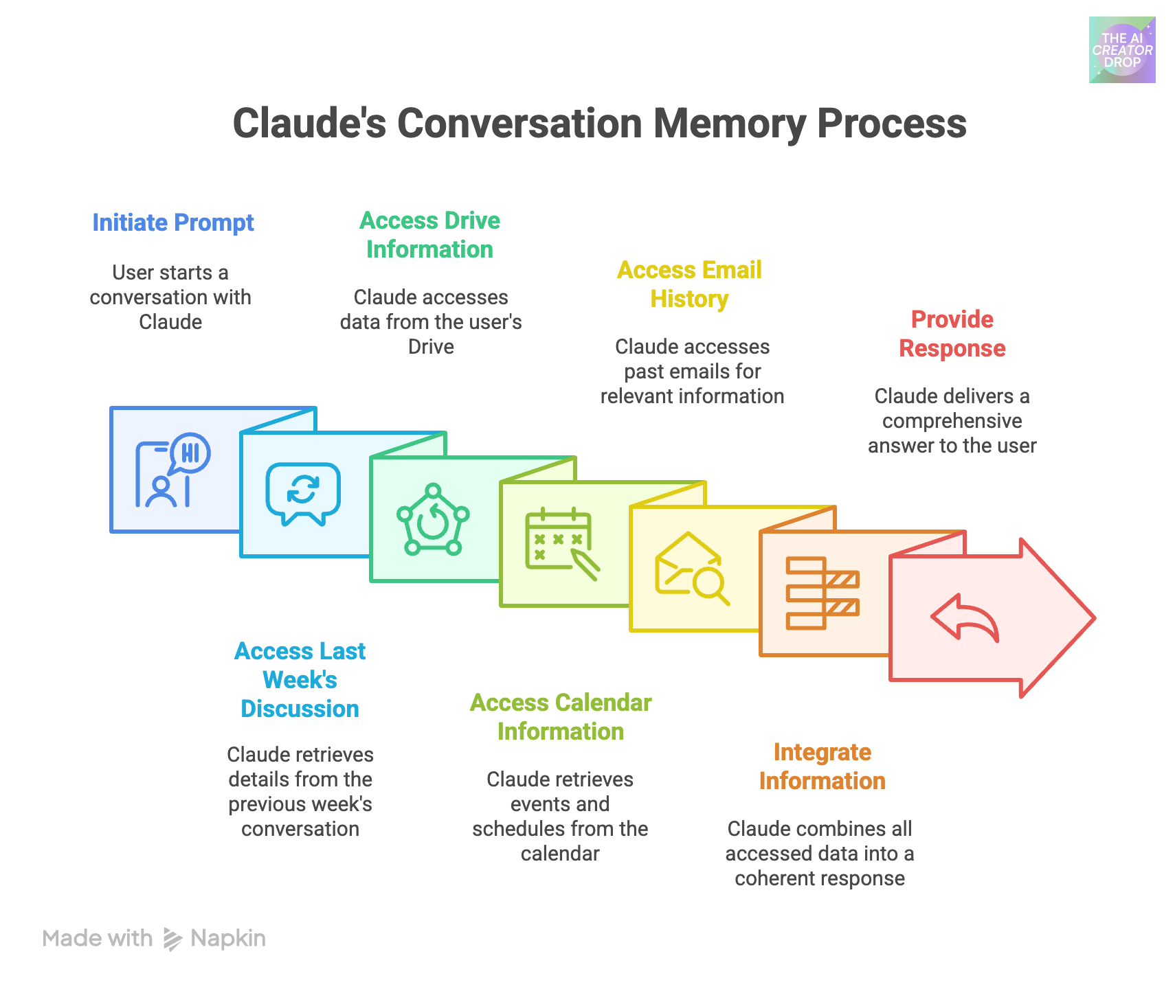 So when you connect Gmail, Calendar, and Drive, Claude doesn't just see your current chat. He searches ALL your past conversations and pulls from your actual work files.