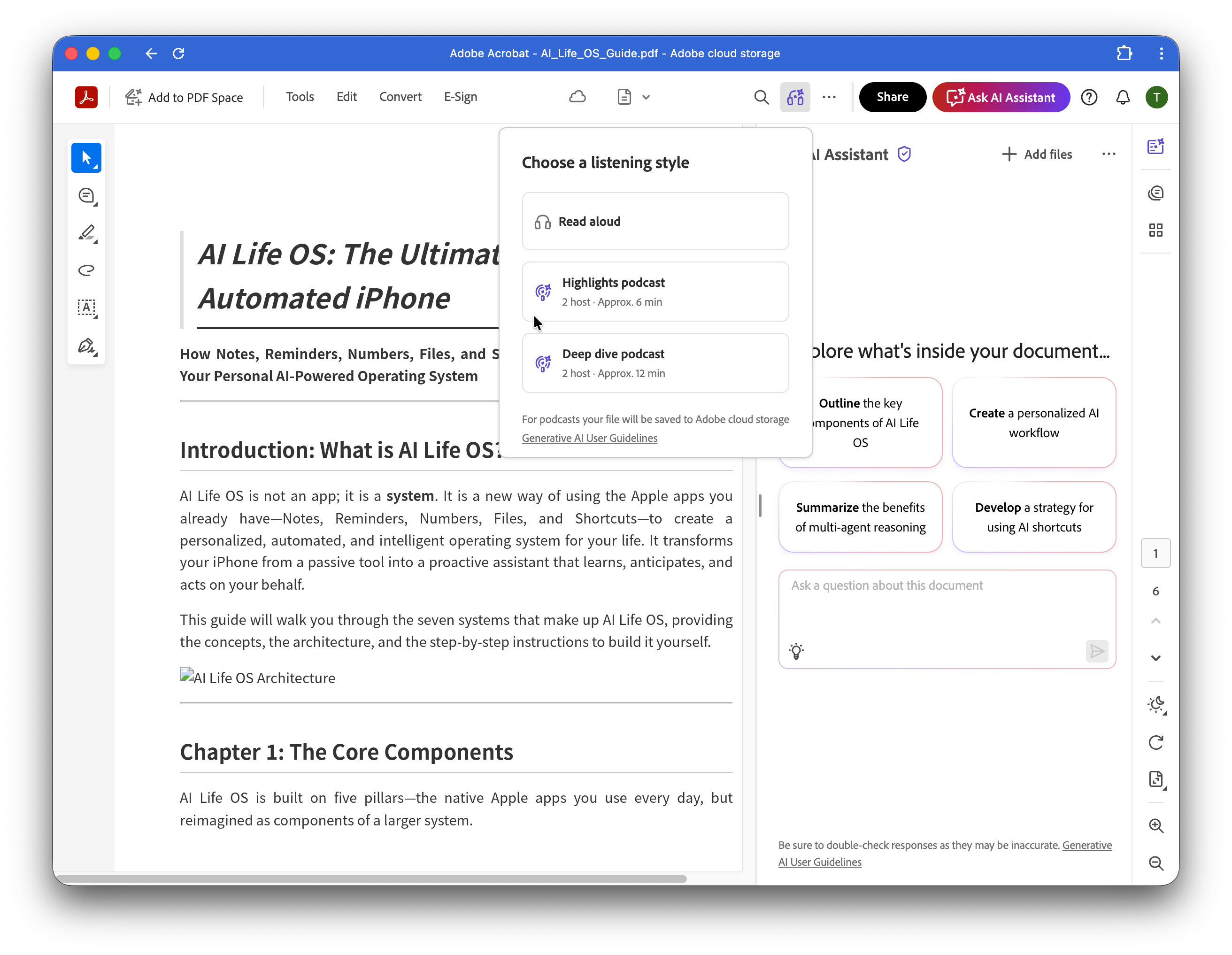 To generate, open the PDF in Acrobat, click to choose a listening style, select your mode (Highlights, Deep dive, or Read aloud), and hit play.