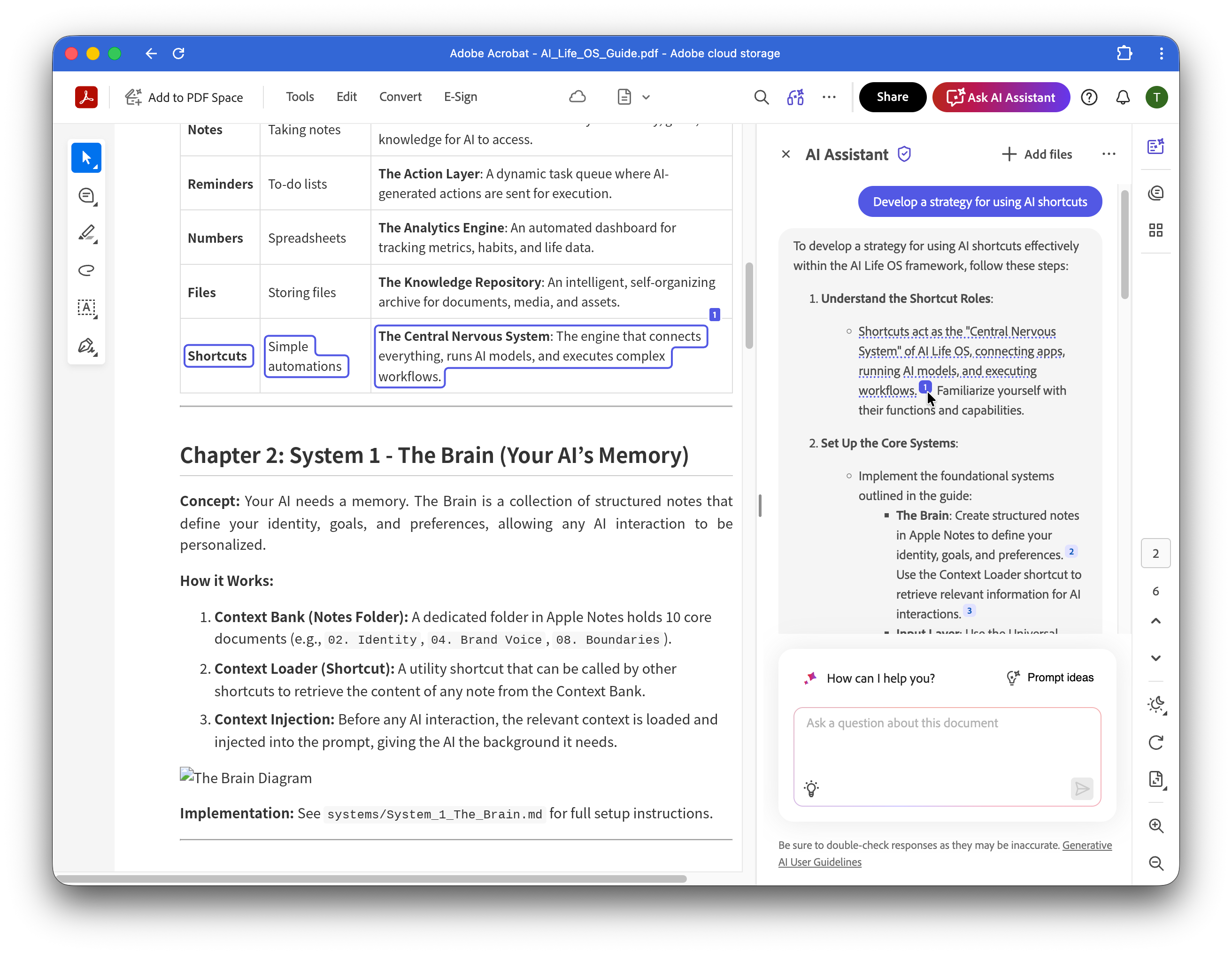 Open your PDF and ask a question in the AI Assistant chat. Review the response and click the citation to verify the source. Acrobat is giving you analysis with receipts