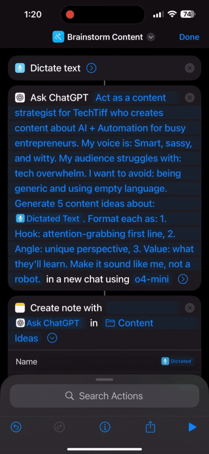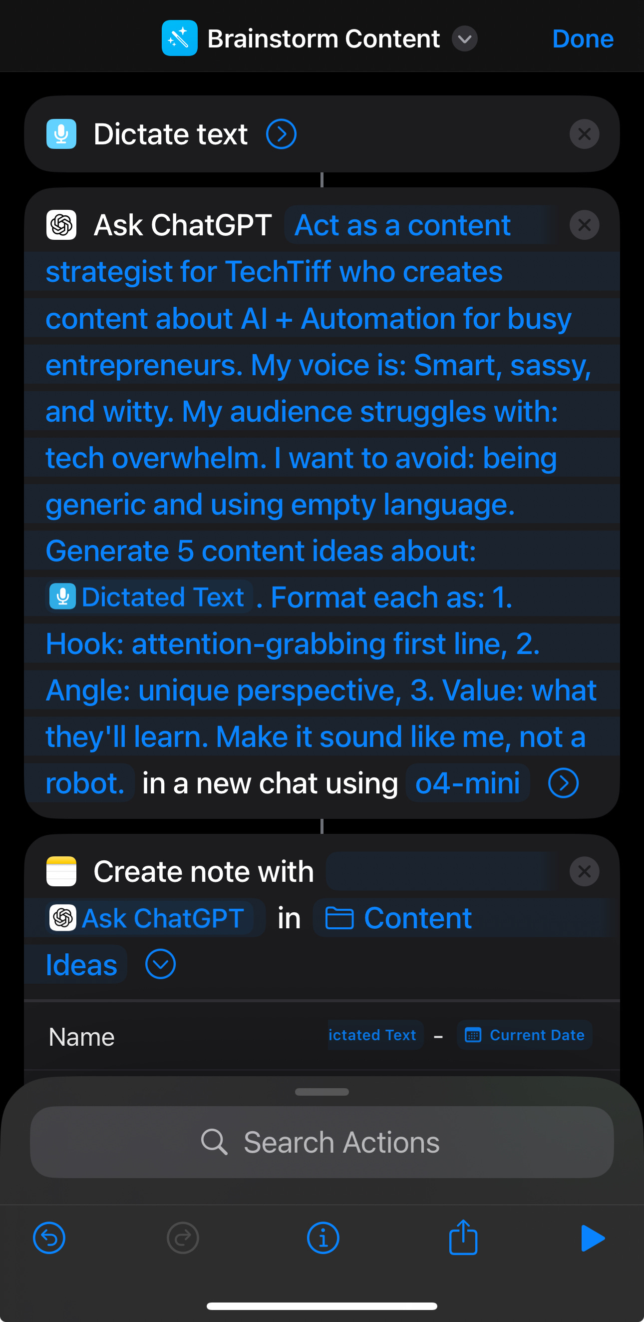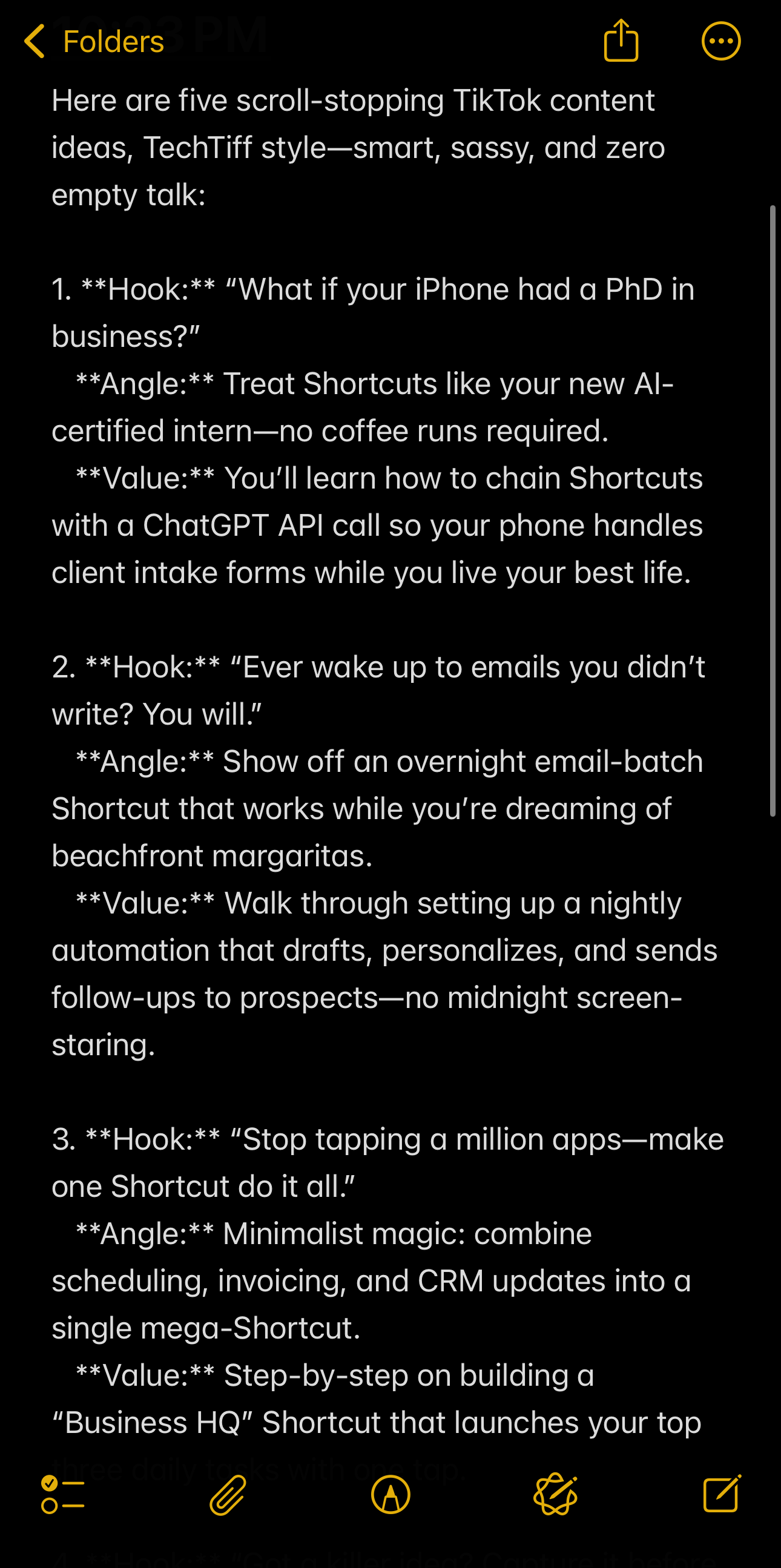 Part 2: The iPhone Shortcut This connects your prompt to ChatGPT and puts the result exactly where you need it—your notes app, your content calendar, wherever. One tap, job done.